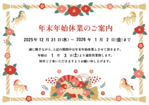 誠に勝手ながら、以下の通り年末年始の期間、営業をお休みさせていただきます。
